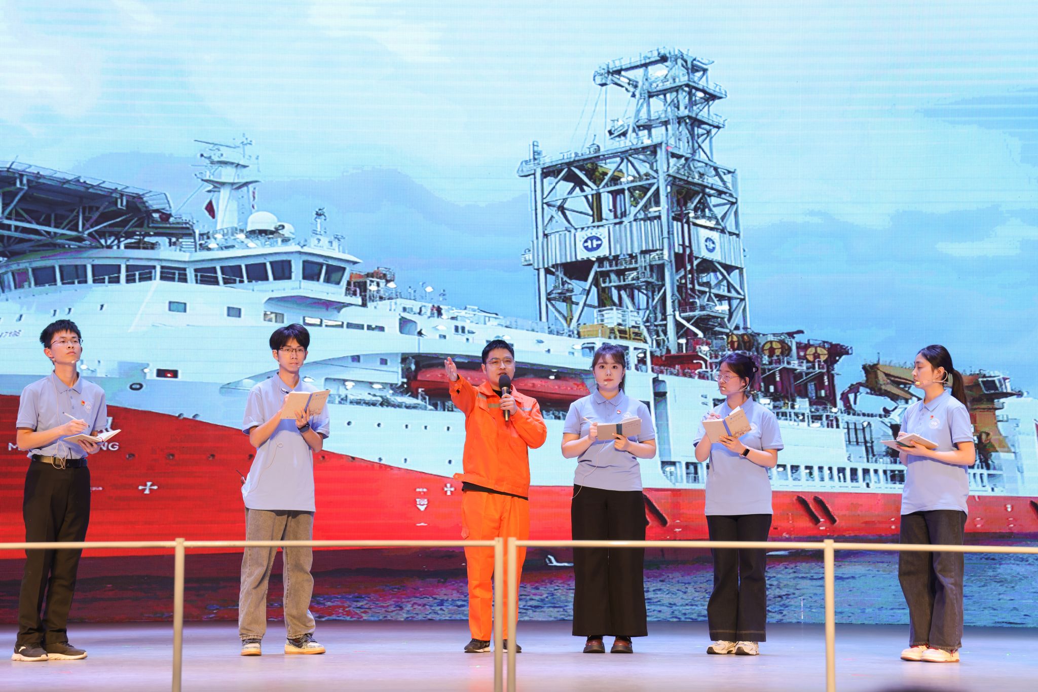 主题党日展演环节,支部成员以原创情景剧《红船薪火,梦想深蓝》深情诠释新时代青年党员的初心使命。该情景剧是以支部成员前往广州海洋地质调查局、嘉兴南湖开展实习实践的真实经历为基础,讲述了支部在参观大国重器的过程中开展的一次特殊的主题党日活动,同时也是一次生动的爱国主义教育思政课。支部成员们在“梦想号”上参观、交流,进而联想到前期在南湖研学的经历,对比跨越百年的两艘船,进而引发了大家对红船精神的思考和讨论,对中国共产党走过百年而屹立不倒的感悟与启迪。